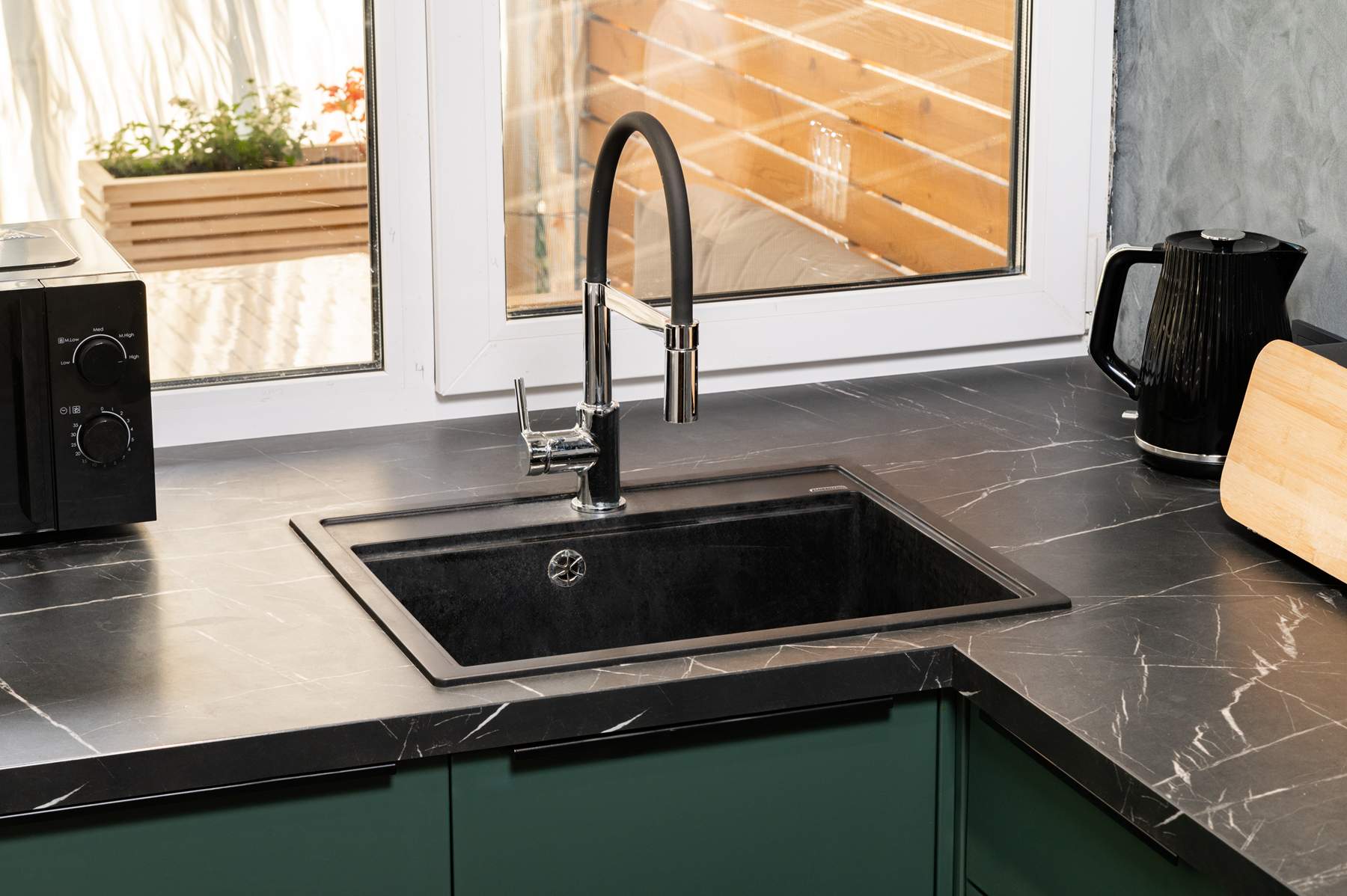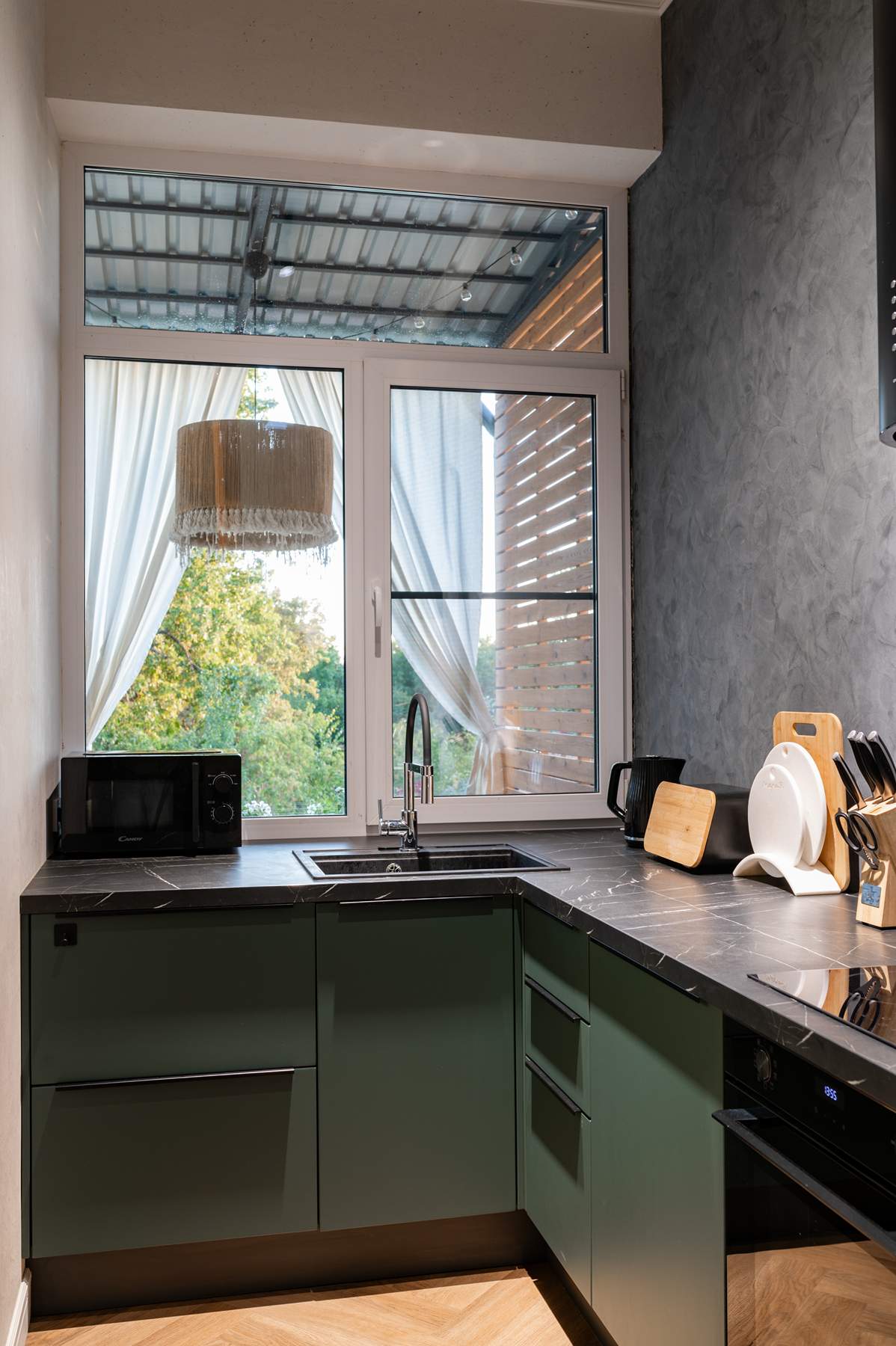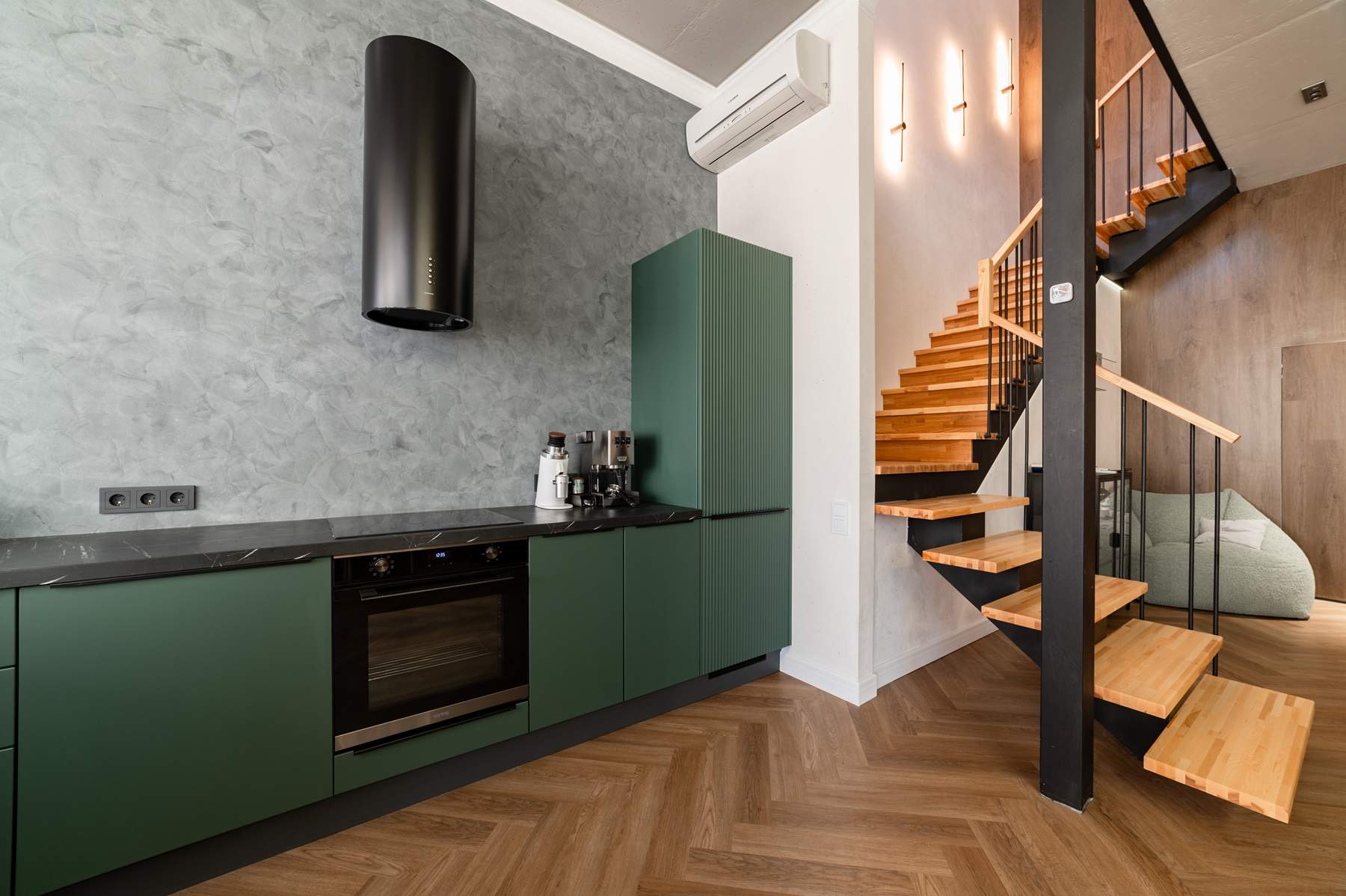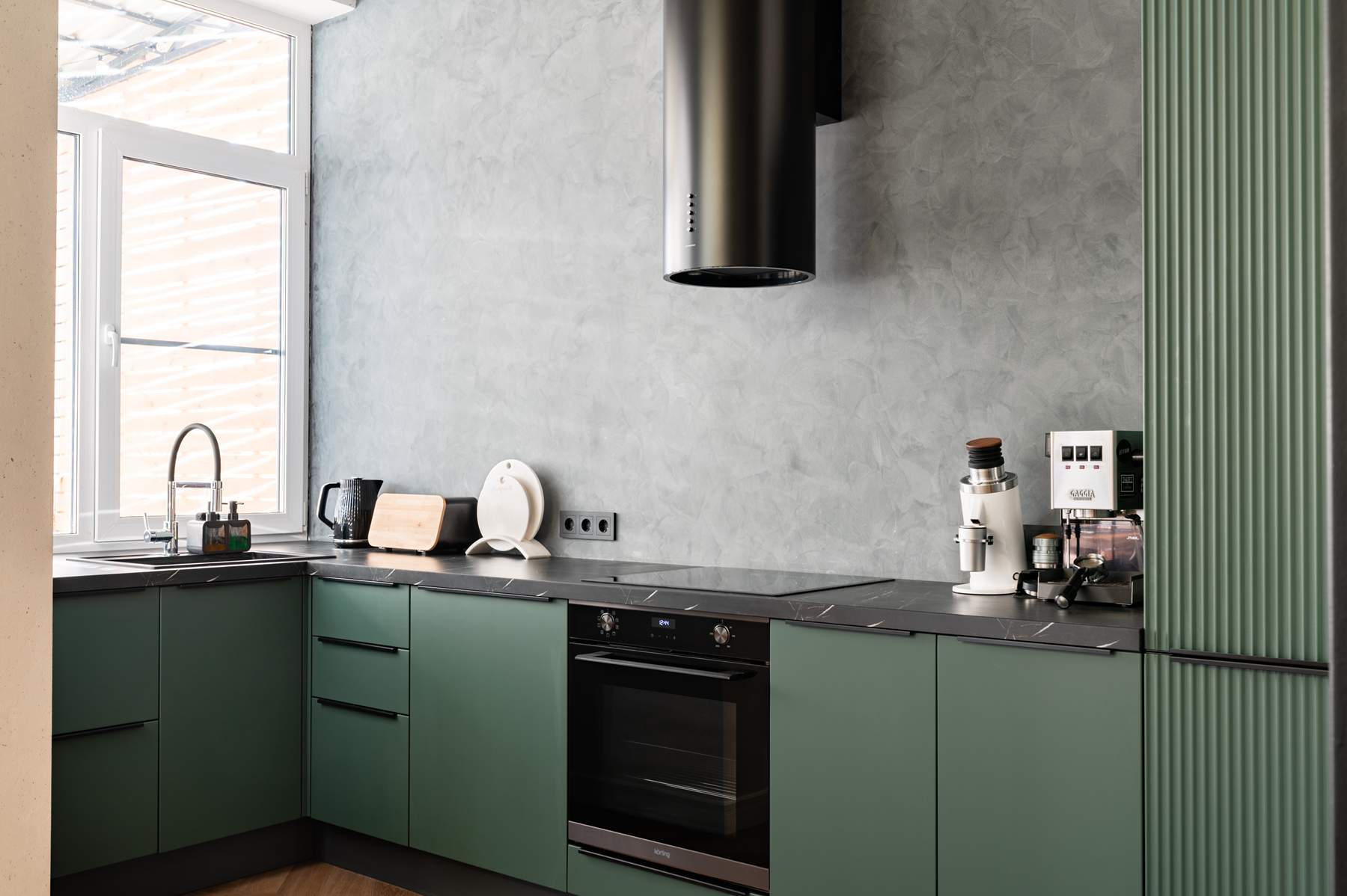 Цветовая палитра гарнитура построена на глубоком и благородном оттенке «темная ель». Матовые фасады с лаконичной фурнитурой гармонично сочетаются с темной столешницей, имитирующей текстуру натурального камня, и акцентной цилиндрической вытяжкой. Несмотря на отсутствие верхних модулей, кухня остается максимально функциональной. Продуманная эргономика нижнего яруса включает вместительные системы хранения и встроенную бытовую технику, что позволяет поддерживать идеальный порядок на рабочих поверхностях.